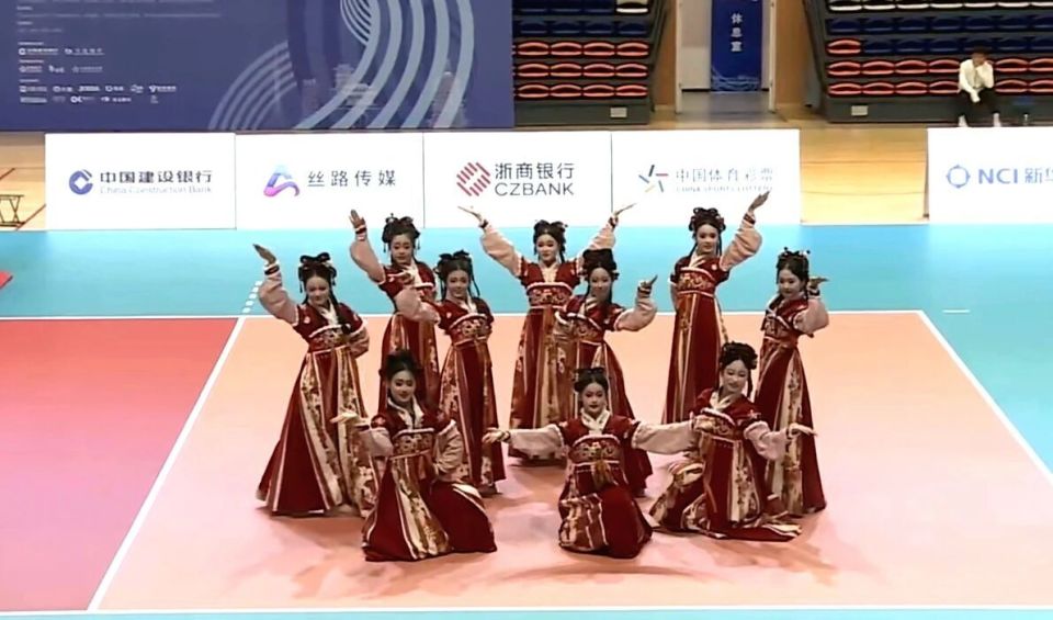当晚的比赛在河南省职工文体中心篮球馆举行。赛前小女排队的热身赛表演精彩激烈,快节奏的说唱、传统鼓舞《天地龙鳞》、啦啦操《星火燎原》活力十足,开封万岁山武侠城景区的演员则带来了既富有古韵又灵动俏皮的歌舞表演《上春山》,活力港区与千年古城的文化碰撞令人眼前一亮。